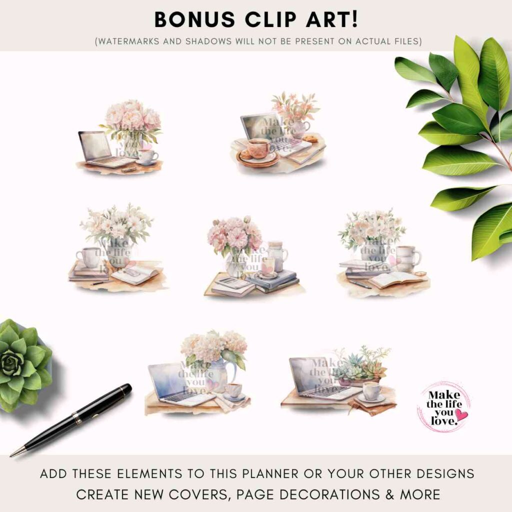 Also included for your commercial use is a small business themed collection of seven (7) custom-created, high-resolution clip art images that you can use to customize this planner or use on any other of your shop’s printables.